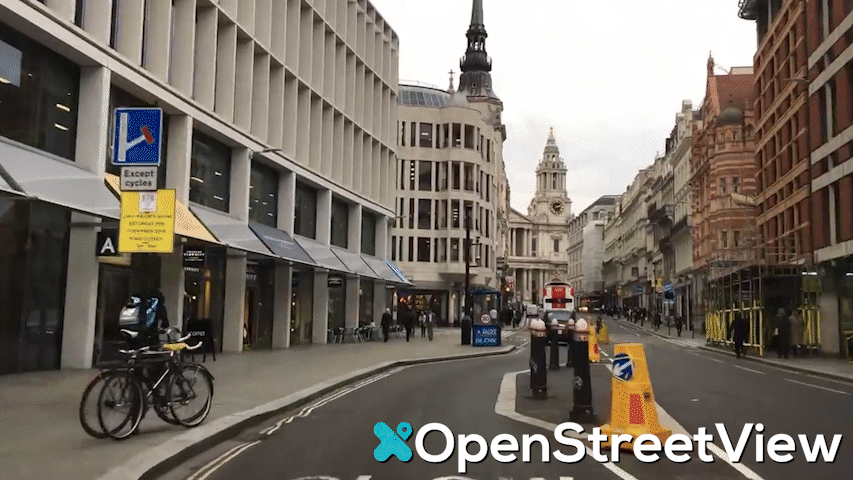 OpenStreetView provides a vehicle eye view of roads for all captured regions. Users can navigate forwards and backwards, automatically transitioning between high resolution captures.